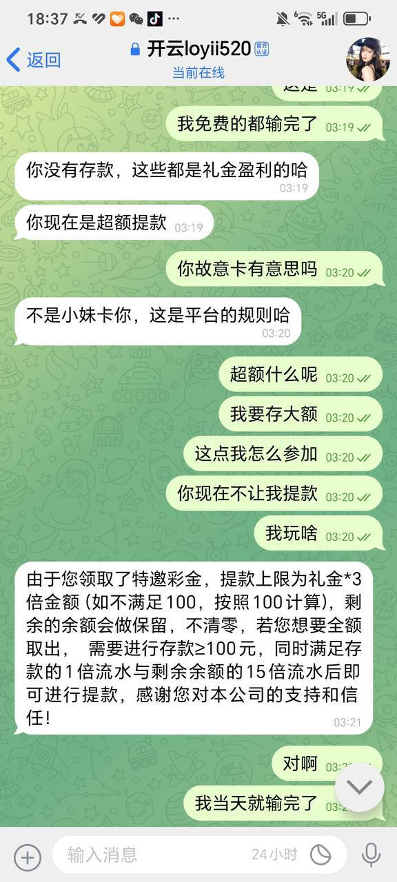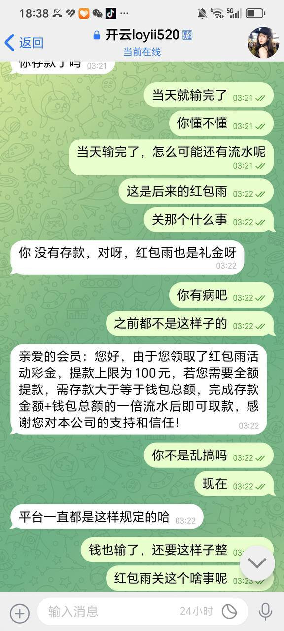 昨天晚上抢了开云的红包雨活动,运气好打到2万多彩金,想着提现开心过年。结果一申请,平台先说回归彩金流水不够,让我继续打流水。我咬牙又滚了几万流水,好不容易满足条件,再次申请时,他们又换理由:存款金额不足,必须再存钱,而且存款要大于账户余额,再打对应流水才能提。